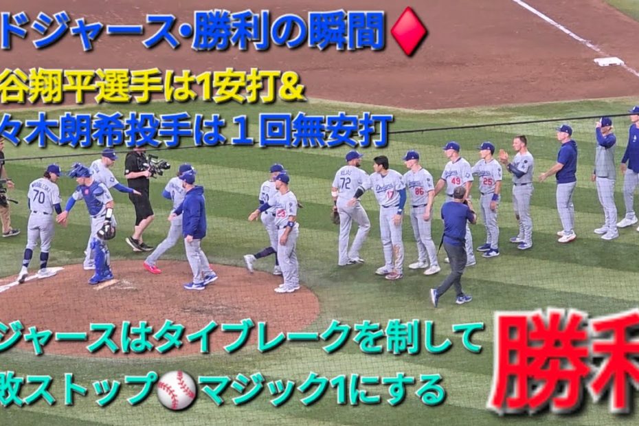♦️ドジャース•勝利の瞬間♦️大谷翔平選手は1安打⚾️佐々木朗希投手は1回を無安打⚾️ドジャースはタイブレークを制して見事な勝利で連敗ストップ⚾️マジック1にしてディビジョン優勝に王手⚾️by admin大谷翔平2025-09-25 ♦️ドジャース•勝利の瞬間♦️大谷翔平選手は1安打⚾️佐々木朗希投手は1回を無安打⚾️ドジャースはタイブレークを制して見事な勝利で連敗ストップ⚾️マジック1にしてディビジョン優勝に王手⚾️ 関連動画: 22号弾に大拍手!大谷翔平 逆転3ランホームランを相手捕手が絶望的な顔で眺める!エンゼルス【現地映像】7月31日 レンジャーズ第3戦 【MLB】大谷翔平 称賛するのは日本人だけじゃない! 現役メジャーリーガーたちが口にする大谷翔平の凄さ! 【大谷翔平】【ドジャース】ドジャース対ブリュワーズ 7/6 【野球実況】 【ドジャース・大谷翔平 流石の一振り!9回に勝ち越しタイムリー!】ここまで無安打だった大谷が見事な適時二塁打!センターを越える54本目の長打でドジャースが勝ち越し コメントを残す コメントをキャンセルメールアドレスが公開されることはありません。 ※ が付いている欄は必須項目です名前 ※ メール ※ サイト コメント ※ 次回のコメントで使用するためブラウザーに自分の名前、メールアドレス、サイトを保存する。 上に表示された文字を入力してください。 前【現地実況】ドジャース・大谷翔平が6回無失点8奪三振と圧巻の投球!「まるで剣のようなボールです」次【救世主】大谷翔平も絶賛!佐々木朗希とカーショーがリリーフ登板でピシャリ3者凡退!ドジャースはついに地区優勝マジック1に!