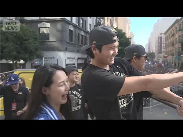 選手たちは2階建てのバスに乗って3キロほどを進み、ワールドシリーズ3勝をあげてMVPを獲得した山本由伸選手や大谷翔平選手、佐々木朗希選手ら日本人の3選手もファンの歓声に応えました。